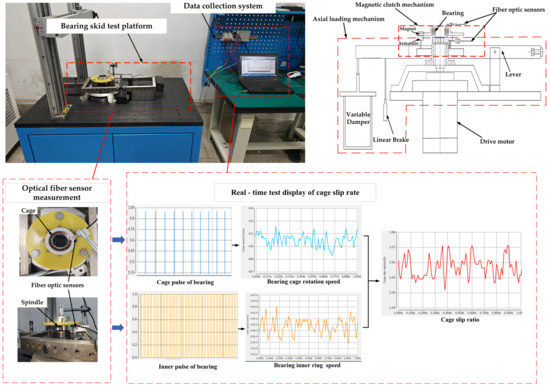 Using the angular contact ball bearing rolling slip test system (as shown in Figure 4), the angular contact ball bearing slippage test is carried out to verify the validity of the rigid–flexible coupling simulation model. In the bearing roll–slip test platform, the inner ring of the bearing is solidly connected to the spindle motor, and the measured spindle speed is regarded as the inner ring speed of the bearing. The axial loading is achieved by a linear brake that drives a wire rope, which in turn moves the lever downwards. The clutch connected to the lever is actuated by the magnetic force of a permanent magnet, causing the bearing housing to move downward, thereby applying axial force to the test bearing. The principle of light reflection reception in optical fiber sensors is applied by affixing reflective strips to the motor spindle and cage, which enables the independent measurement of the cage speed and the inner ring speed . The cage slip rate Sc is calculated using Equations (11) and (12).