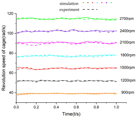 The contact stiffness between the rolling body, inner and outer ring, and cage in the simulation model is defined as = 1.866 , = 1.467 , and = 0.879. The Dynamic slip speed = 100 mm/s, the static slip speed = 1000 mm/s, the dynamic friction factor = 0.1, the static friction factor = 0.02, and the rated dynamic load of the bearing C = 200 N. According to ISO 281 standard (C/P), the simulation and test use the axial load P = 100 N, that is, the load factor C/P = 2 and the inner ring speed of 900~2700 rpm under the working conditions of the cage speed change with the time curve shown in Figure 5. Based on the average cage speed, the average cage slip rate of the test and simulation is shown in Figure 6.