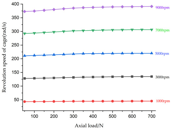 Simulations were carried out for bearing speeds of 1000~9000 rpm and axial loads of 50~700 N, that is, load factors C/P of 0.29~4, to analyze the effect of axial load changes on the average slip rate of the cage at different inner ring speeds. The angular speed of the cage is shown in Figure 7. The cage slip rate is calculated according to Equation (11) with the axial load variation law at different inner ring speeds, and the discrete points of the slip rate are fitted linearly with the axial load (x-axis) as the independent variable and the cage slip rate (y-axis) as the dependent variable, as shown in Figure 8.