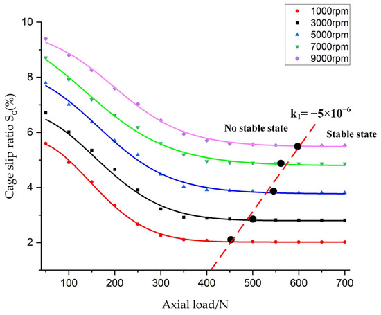 Based on the simulation model, Figure 7 illustrates the relationship between cage speed and axial load. When the axial load remains constant, the cage speed increases with the bearing speed. When the bearing speed is kept constant, the cage speed increases with the axial load until reaching a stable state. Figure 8 displays the fitting curve depicting the variation of cage slip rate with axial load for different inner ring speeds. The slip rate of the cage decreases gradually with the increase of axial load until it reaches a stable state. The critical value for the slope of the curve fitting change is = −5 × 10−6. When the slope of the curve exceeds , the bearing is considered to be in a stable state. When the bearing speed is higher, the slope of the fitted curve is greater than (into the stable state), and the greater the axial load required.