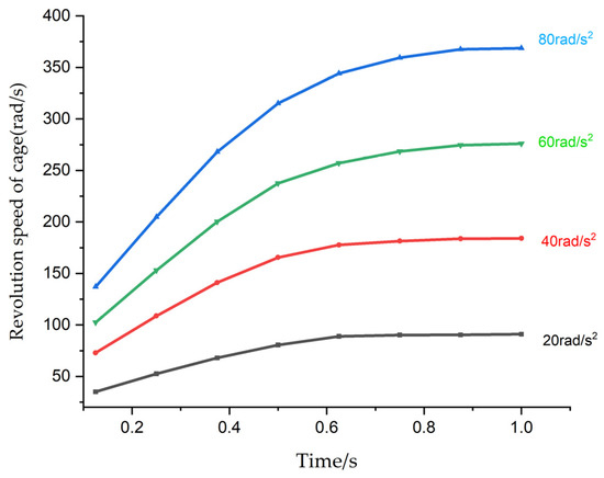In order to investigate the law of bearing slip characteristics, on the basis of verifying the validity of the simulation model, this section further investigates the simulation of the bearing under different speed and angular acceleration conditions. By calculating the center of mass speed of the cage in the simulation process, the law of change in the slip rate of the cage under different working conditions is analyzed.