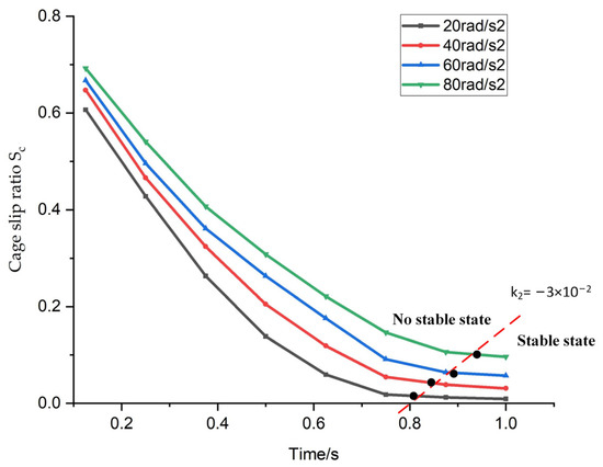The variation curve of the cage speed with time under accelerating conditions is depicted in Figure 9. At a certain time, with an increasing angular acceleration of the bearing, the cage speed increases while the slip rate decreases. The fitted curve representing the change in cage slip rate with time under different angular accelerations is shown in Figure 10. The critical value for the slope of the fitted curve is set at = −3 × 10−2. When the slope of the curve exceeds , it indicates that the bearing has reached a stable state. As the angular acceleration conditions increase, it takes a longer time for the slope of the fitted curve to exceed and enter the stable state.
