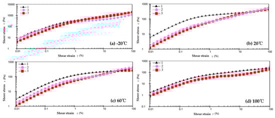 The stress–strain curves of the three greases at different temperatures are shown in Figure 3.