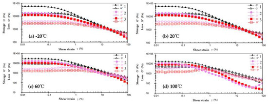 When the temperature reaches 100 °C, as shown in Figure 4d, as the strain amplitude increases, the storage modulus decreases slowly and then rapidly, and the loss modulus tends to increase gradually. This is related to the so-called “weak strain overshoot”.