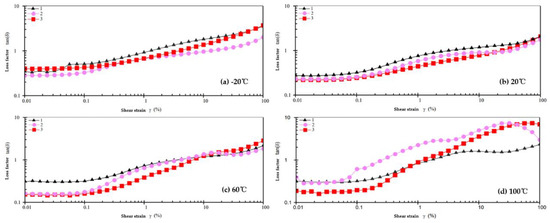 In order to more accurately describe the change law of the grease properties during strain scanning, the data of the loss factor of the grease with strain values at different temperatures were experimentally obtained, as shown in Figure 5. The variation law of the loss factor with strain can directly reflect the energy loss of the grease under the action of force and can also more intuitively represent the viscoelastic properties and rheological nature of grease.
