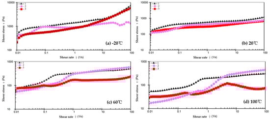Shear stress–shear rate rheological curve of grease. (a) −20 °C; (b) 20 °C; (c) 60 °C; (d) 100 °C.