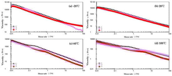 Viscosity–shear rate rheological curve of grease. (a) −20 °C; (b) 20 °C; (c) 60 °C; (d) 100 °C.