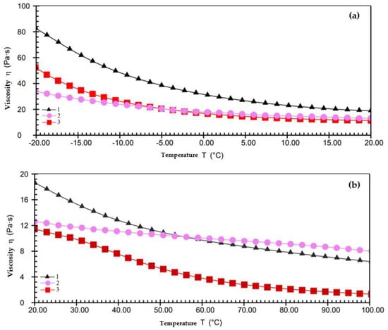 Viscosity–temperature rheological curve of grease. (a) −20 °C to 20 °C; (b) 20 °C to 100 °C.