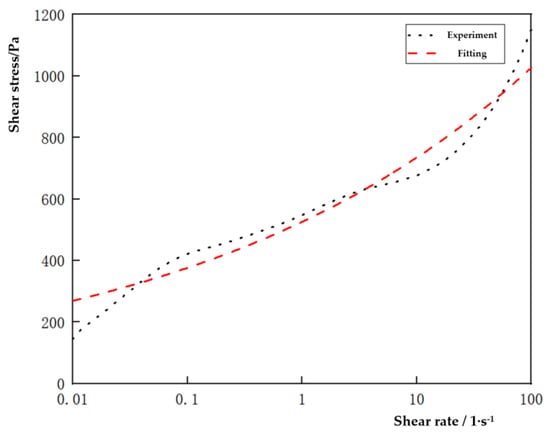 According to the experimental data given in Table 4, the data fit of the H–B model to the flow curve was plotted in linear coordinates as shown in Figure 9. The results show that the rheological model fits the experimental data well, and the rheological parameters can be used to describe the rheological properties of the grease by the rheological model, so as to obtain the intrinsic equation of the grease at each temperature.