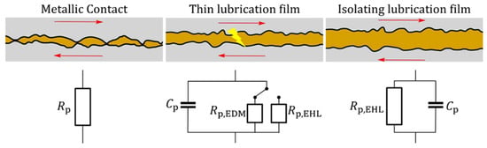 The description of the EHL contact as a plate capacitor is only possible when a separating lubrication film exists. In the case of dry friction, direct metallic contact between the rolling elements and the runways leads to a resistive behavior, which means that this condition can be understood as ohmic resistance. An intermediate state can be observed when the lubricant separates the rolling elements and the runway completely so that metallic contacts are avoided. It can be described as an ohmic resistance in parallel connection to a plate capacitor. When the lubrication film is not thick enough, harmful EDM currents occur, damaging the surfaces. This needs to be avoided for sensory usage of the impedance measurement method. Figure 2 gives an overview of the three conditions [,,,].