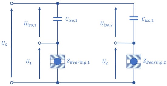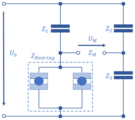The voltage of the generator and the voltage over the reference impedance are detected. Therefore, the capacity of isolation of the test rig is measured and applied as a reference. In the used configuration, two rolling bearings are observed simultaneously. The impedance is calculated from the known capacity and the measured voltages using the following equations []: