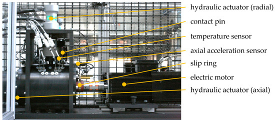 The four bearings in a chamber are placed on the same shaft, which is electrically contacted using a slip ring. The bearing seats consist of two parts, separated by an insulating ceramic layer. A contact pin bypasses the insulation of the electrically observed test bearings. Within one of the chambers, two of the four bearings are investigated using impedance measurement methods. The exact configuration for the performed fatigue tests can be read in Martin et al. [], which is also applied to the new measurement approach tested here for a better comparison. The bearings can be loaded with radial and axial forces by hydraulic actuators.