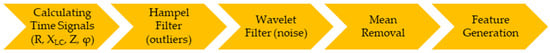 These four signals are further processed. Outliers are removed using a Hampel filter, whose mathematical explanation is described in []. A noise filter reduces noise due to the measurement setup and environmental influences. Using wavelets for noise filtering is especially effective when reducing noise while preserving abrupt changes with high-frequency components of the signal []. The impedance signal of a damaged rolling bearing is characterized by abruptly occurring peaks in the real and imaginary parts []. Therefore, preserving the high-frequency components of the signal is of high importance, which is why a wavelet filter is applied for noise reduction. To prevent misleading signal interpretation due to errors in the measurement setup, the mean value is removed. For this purpose, the mean value of the impedance signal in the run-in stage is subtracted from the signal itself.