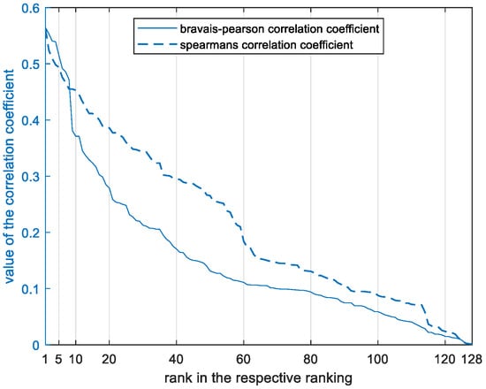 The resulting correlation coefficients of each feature with the label, sorted by their rank in the respective ranking, are displayed in Figure 7. A group of features characterizes the resulting distribution with high correlation coefficients compared to the remaining features. Since the ten highest-ranked features stand out with a particularly high correlation in both rankings, these features are considered for further investigation.