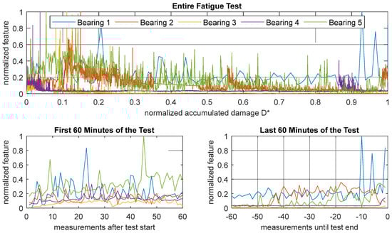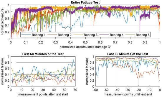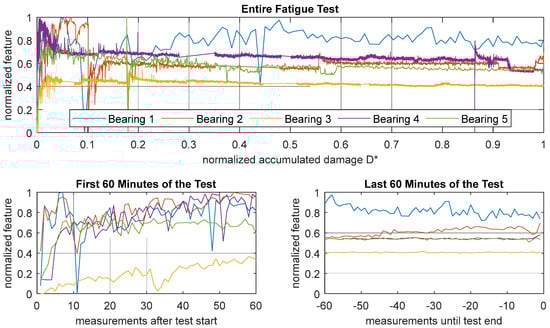 In Figure 8, some noticeable abnormalities and characteristics are addressed in the following and explained in Section 4. At the beginning of the test, the feature values of the different tests seem to rise at a different pace. Also, there are visible gaps in the graphs, like at bearing 2 in the range of the normalized damage from to and at bearing 4 from to . Another abnormality can be seen at bearing 3 at approximately and at bearing 4 at . There, the features suddenly jump to a new level on which they remain for a while.