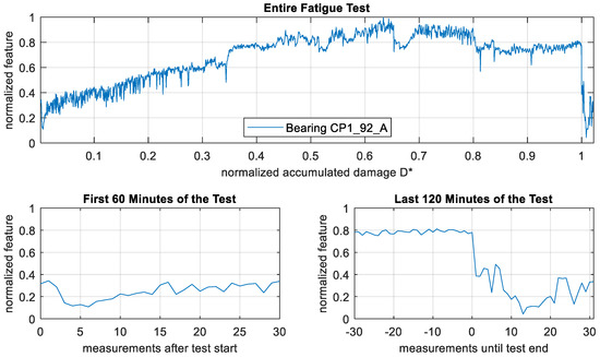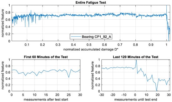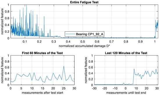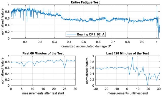 Table 4 shows different high-ranked features when looking at the last hour of the fatigue test compared to the whole bearing lifespan. In conclusion, some features are especially significant in the time interval shortly before initial damage, while others possess more information about the damage progression over the whole bearing life. This explanation is plausible since the pre-run-in stage shows similar behavior to the signal before initial damage []. Consequently, features that are significant in the last hour of the test may not be significant over the whole lifespan due to the influence of the pre-run-in stage.