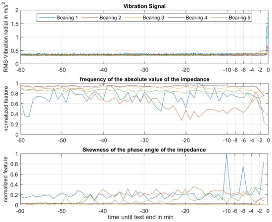 The individual feature selection is performed twice at different time intervals. Firstly, all measured data are taken into consideration; thus, the whole lifespan of the tested bearing is observed. Secondly, the last hour before initial damage detection by the test rig is exclusively studied. This enables the observation of the behavior of a feature before initial damage without the influence of the pre-run-in stage. This is of high interest because this stage shows similar effects in the impedance signal to the impedance signal after the initial damage [].