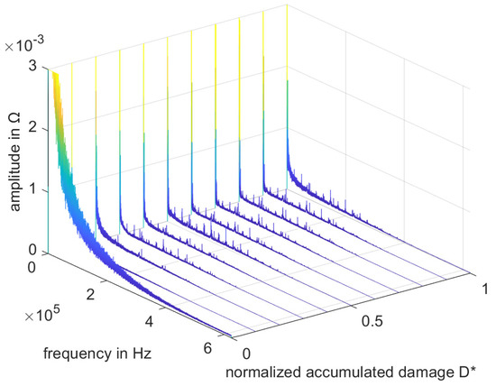 In the run-in stage, the surface roughness peaks are smoothened, resulting in fewer electrical breakdowns and less noise in the impedance signal. The low frequencies, induced by the high surface roughness, are no longer present, which leads to a higher central and RMS frequency according to the corresponding formula (see Table 3). In Figure 16, this is visible in the decline of amplitudes of the low frequencies with progressing total damage.