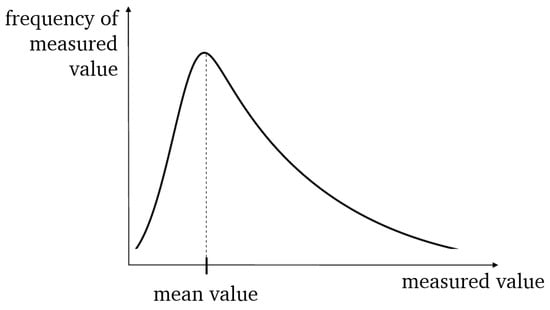 Before the end of the fatigue test, the skewness again shows distinctly higher values. The high feature values in both the pre-run-in and damaged phase can be phenomenologically explained: A positively skewed distribution describes a graph as shown in Figure 17 [].