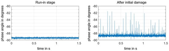 Electrical breakdowns in the pre-run-in and damaged phases lead to signal changes of the impedance with resistive characteristics (see Figure 18 right). Resistive behavior leads to a phase angle closer to zero, which, in this case, results in positive impulses of the phase angle. These positive impulses can be seen in Figure 17 in the form of measurement amplitudes on the right-hand side of the mean value; the more resistive the behavior, the higher the skewness of the phase angle.