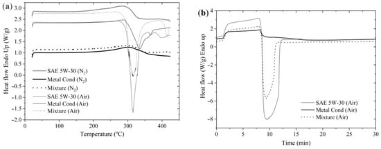 Thermal and thermo-oxidative properties were determined using differential scanning calorimetry. The first methodology involved non-isothermal scans in both an inert (nitrogen) and an oxidizing atmosphere (synthetic air). Figure 1a shows the curves obtained in both atmospheres. When scanning in a synthetic air atmosphere, all the analyzed lubricants exhibited an oxidation degradation peak within the temperature range 22–425 °C. The mixture displayed a thermo-oxidative degradation peak at the same temperature (315 °C) as the 5W-30 oil. However, the oxidation peak of the MC was observed at 334 °C.
