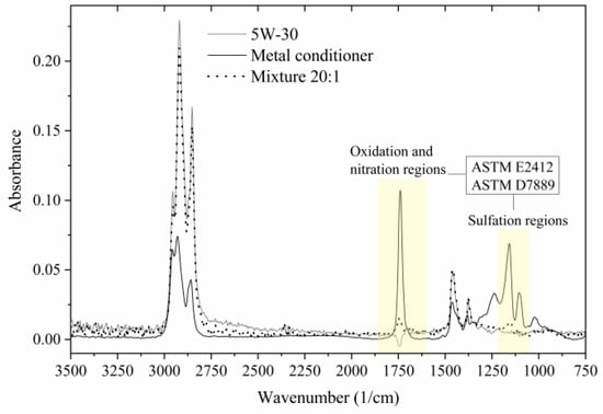 Figure 2 clearly illustrates several differences between the spectra of the 5W-30 lubricant and the metal conditioner, as outlined in Table 3. The spectrum of the mixture combines the characteristic bands of each component.