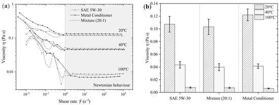 All evaluated lubricants demonstrated Newtonian behavior at strain rates > 1 s−1 across all temperatures and geometries. However, in the region of low shear rates (<1 s−1), all flow curves (Figure 3a) exhibited non-Newtonian behavior, specifically pseudoplastic (shear thinning behavior). It is worth noting that viscosity values for low shear rates are of lesser interest since the lubricated elements in the engine operate at very high shear rates [26,27,28]. Moreover, undesired outputs due to wall slip are common in the low shear zone [26,29]. Therefore, the average of the viscosity values obtained from both geometries in the Newtonian regime was calculated, and the results are summarized in Figure 3b.