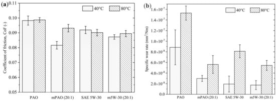 (a) Coefficient of friction (CoF). (b) Specific wear rate (mm3/Nm) of the moving body. Reciprocating motion between the counter-body (AISI 52100, Ø10 mm) and moving-body (AISI 4140): Po = 1.7 GPa; 5 Hz; 10 mm stroke; 3600 s; abundant lubrification. Error bars represent the standard deviation. mPAO and m5W-30 represent the mixture of each oil with MC.