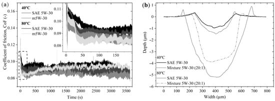 The coefficient of friction (CoF, Figure 4a) remained at around 0.09 for both SAE 5W-30 and its mixture at both temperatures, which is typical for metal-to-metal lubricated contacts under early mixed and boundary lubrication [31]. The CoF as a function of time is displayed in Figure 5a. During the initial approximately 50 s of the test, a phenomenon known as the running-in period was observed. This transitional phase was characterized by a decrease in the CoF from its initial value. After the running-in period, the CoF stabilized at an approximately constant value (steady-state friction) for all conditions throughout the entire experiment.