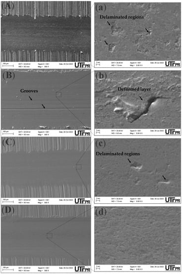 SEM micrograph of wear tracks: (A,a) SAE 5W-30 at 40 °C; (B,b) SAE 5W-30 at 80 °C; (C,c) mixture at 40 °C; (D,d) mixture at 80 °C.