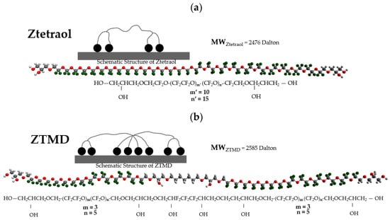 Schematic structure of a lubricant chain on the DLC surface, molecular weight, and chemical structure of (a) Ztetraol and (b) ZTMD. In the schematic, the black sphere and the line in between represent the –OH endgroup and backbone of a PFPE lubricant, respectively.