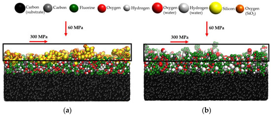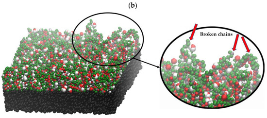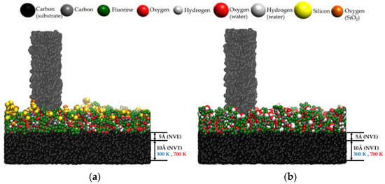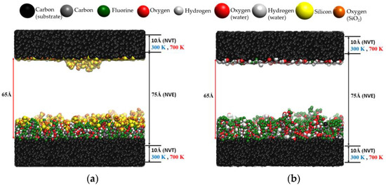 To avoid the escape of contaminant molecules out of the simulation box, the prepared chemical contaminants were placed in between the top bare DLC film and the bottom lubricated DLC film with a gap distance of 65 Å. An indirect heat bath method was chosen and applied on both DLC films, i.e., heating a microcanonical ensemble (NVE) with a canonical ensemble (NVT) as a heat bath, as shown in Figure 2, because direct heating in a system can increase the potential energy infinitely [49]. To adsorb the contaminants onto the PFPE lubricants, a randomly distributed set of SiO2 and H2O molecules (1 set = 256 molecules) was placed in the gap, and then the equilibration proceeded at 300 K and 700 K for 200 ps. To achieve the relevant amount of SiO2 contamination, four sets of SiO2 contaminants were applied in sequence, while two sets of H2O contaminants were applied. In order to accelerate the reaction between the lubricant and water molecules, supersaturation conditions were chosen for each set of H2O contaminants in the gap, having supersaturation ratios of 500 and 125 at 300 K and 700 K, respectively, where the supersaturation ratio is the density of the applied water vapor over the density of saturated water vapor [50,51,52].