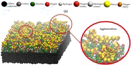 The total energy term, Esystem, in Equation (1) is interpreted as the sum of the various energy terms. Ebond, Eover, Eunder, Etor, Eval, Elp, EvdW, and Ecoulomb are the energy terms of the bonds, over-coordination, under-coordination, torsion angle, valence angle, lone pair, van der Waals, and coulombic interaction, respectively [33]. Compared to non-reactive force fields, ReaxFF includes additional concepts, such as the bond order, under-coordination, and over-coordination terms, which ensure adaption to the instantaneous configuration in the reactive system [34]. The applied ReaxFF potential parameter set in this study was developed by Chipara et al. [35], combining C/H/O interactions [32,36], the Si/C interaction [37], and the newly trained C/F interaction [35]. To perform MD simulations, the ReaxFF parameter set was applied in a LAMMPS (Large-scale Atomic/Molecular Massively Parallel Simulator) [38].