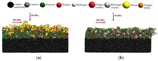 The normal and tangential stresses (i.e., 60 MPa and 300 MPa, respectively) were applied to the prepared lubricated film samples for 100 ps. As shown in Figure 6, the resulting shear displacement was obtained by comparing the positions of lubricant atoms before and after applying the stresses. Since the lubricant molecules have stronger bonds to the underlying DLC surface through polar interactions, the shear displacement is mostly observed on the top layer of the lubricant. It was found that the PFPE lubricants (Ztetraol and ZTMD in this study) became stiffened by SiO2 nanoparticles, having a limited amount of airshear displacement (Figure 6a), while water molecules significantly degraded and weakened the PFPE lubricants, causing greater airshear movement (Figure 6b).