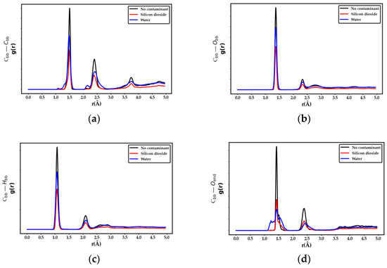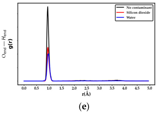 In order to investigate the interactions among the PFPE lubricant and contaminants, radial distribution functions were obtained for the Ztetraol lubricant with and without contaminants (i.e., SiO2 and H2O) through LAMMPS [38]. Figure 8 shows the RDF results for the possible covalent bonds, including Cbackbone–Cbackbone, Cbackbone–Obackbone, Cbackbone–Hbackbone, Cbackbone–Oendgroup, and Oendgroup–Hendgroup.