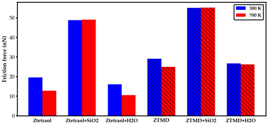 The measured friction force for the two PFPE lubricants with and without the SiO2 and H2O contaminants at 300 K and 700 K. Note: Regular bars for Ztetraol and slanted bars are ZTMD lubricant.