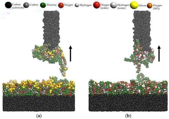 For both Ztetraol and ZTMD lubricants, the percentages of adsorbed SiO2 contaminants were similar in 300 K and 700 K. However, for the case of H2O contaminants, the adsorption rate onto Ztetraol was higher than that of ZTMD by 13.8% at 300 K and 18.6% at 700 K, as summarized in Table 1. Also, when SiO2 nanoparticles were adsorbed onto the PFPE lubricants, they did not physically damage the lubricant chains and showed agglomerative behaviors, as shown in Figure 5a, consistent with the previous study [21]. However, for H2O contamination, the adsorbed H2O molecules influenced the lubricant chains, causing critical bond breaks, as shown in Figure 5b.
