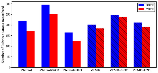Quantification of lubricant atoms transferred after the retraction of the cylindrical head. Note: Regular bars for Ztetraol and slanted bars are ZTMD lubricant.