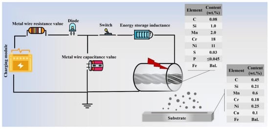 In this study, a commercially available 321 austenitic stainless steel wire alloy was sprayed on a AISI1045 steel substrate using an electro-explosive spraying device. The 321 austenitic stainless steel wire could provide a proper corrosion resistance behavior, due to its stabilization, by adding titanium against chromium carbide formation []. Therefore, this stabilized alloy is able to lead an excellent resistance to intergranular corrosion. As is described in Figure 1, the AISI1045 steel (10 × 10 × 20 mm3) comprises C, Si, Mn, Cr, Ni, Cu, and Fe elements with the weight ratios of 0.45, 0.21, 0.60, 0.18, 0.25, 0.10, and balance wt.%, respectively. In addition, the 321 austenitic stainless steel (1.5 mm diameter) contains C, Si, Mn, Cr, Ni, S, P, and Fe with respective ratios of 0.08, 1.00, 2.00, 18.00, 11.00, 0.03, 0.045, and balance wt.%.