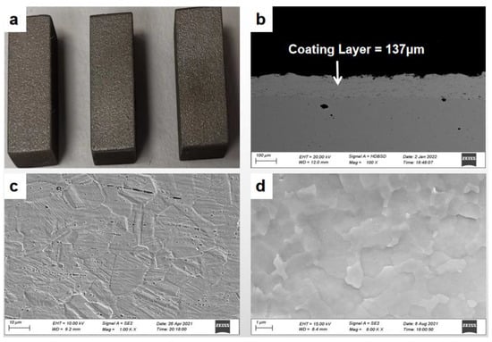 Morphological characteristics of the AISI1045 steel substrate coated with alloy 321 droplets; (a) macroscopic image of the provided specimen, (b) SEM image of the electro-explosive 321 austenitic stainless steel metal wire coating layer on the AISI1045 steel substrate, and SEM images of the 321 alloy wire (c) before and (d) after the coating.