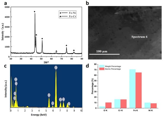 The XRD pattern of the coating surface prepared by electric explosion after corrosion at 60 °C for 168 h in oil and water is provided in Figure 5a. According to the pattern, the products after the corrosion procedure include CaCO3, Fe3O4, and MgFe2O4. The Fe-Ni phase was observable in the spectrum, relating to the coating layer. Additionally, NaCl is the residue of the solute in the etching solution. It is worth noting that the Cr diffraction peak could be overlapped by NaCl peaks. Thus, it is not highlighted in the XRD pattern, while it could be present in the specimen. Figure 5b depicts a cross-sectional SEM image of the coated AISI1045 steel by 321 austenitic stainless steel droplets. The EDS spectra in two determined zones of the coated layer are also represented in Figure 5c,d. Based on the observed elements and their weight percentages, the presence of O and Cl elements were detected between the coating layer and the substrate. This might be related to the minute gaps in the coating, allowing corrosive ions in the solution to penetrate the coating and substrate, leading the coating and substrate to corrode [].