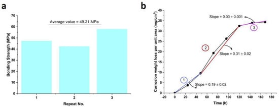 (a) Bonding strength between the alloy 321 and AISI1045 steel before the corrosion examination, and (b) corrosion kinetic curve of the coated sample after 168 h.
