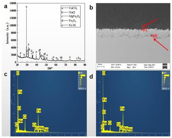 Morphological features of the specimen after corrosion in oil and water at 60 °C for 168 h: (a) XRD pattern, (b) SEM, and (c,d) EDS spectra in two specific zones.