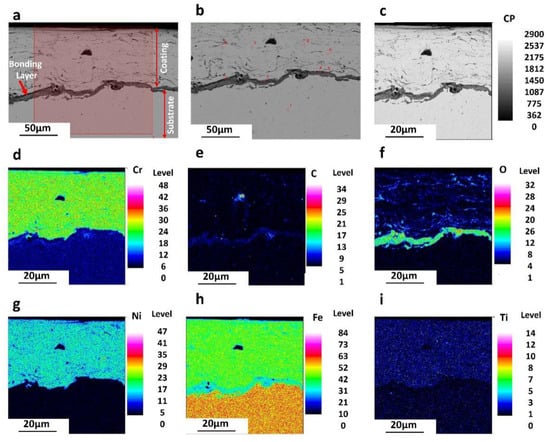 Corrosion products of the coated samples were identified using an electron probe micro analyzer (EPMA), which is described in Figure 6. As could be seen in Figure 6a, the image mapping could be divided into three main regions, including substrate, bonding boundary, and the coating layer. Point analysis in various positions is also determined in Figure 6b. Figure 6c–i also illustrates the distribution of different elements, including CP, Cr, C, O, Ni, Fe, and Ti in the coated sample after the corrosion examination. In the substrate, the presence of CP and Fe are highlighted, as is observable in Figure 6c,h. Meanwhile, Cr and Fe elements were distributed homogenously in the coating layer, which is effective in the enhancement of the corrosion resistance Figure 6d,h. Additionally, the presence of the O element was gradually decreased in the direction from the coating layer to the substrate. Moreover, Figure 6i confirms the presence of the Ti element with a low percentage in both coating and substrate layers.