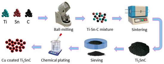 An experiment schema of Cu-coated Ti2SnC ceramic is presented in Figure 1. Here, Ti (400 mesh, 99.5 wt.% pure), Sn (300 mesh, 99.8 wt.% pure), and graphite (400 mesh, 99.5 wt.% pure) powders were chosen as the starting materials to prepare the Ti2SnC ceramic. Briefly, the above three powders were uniformly mixed with a molar ratio of 2:1.1:1. Then, the mixed powders were first heated at a heating rate of 10 °C/min from room temperature to 1250 °C, and then sintered at 1250 °C for 1 h under an argon atmosphere in a tube furnace. At last, the as-sintered Ti2SnC specimen was ground into powders in a milling machine and sieved using a sifter (800 mesh).