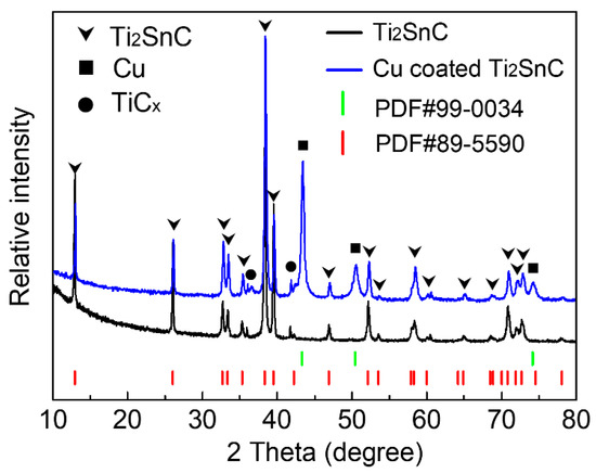 XRD patterns of as-prepared Ti2SnC and Cu-coated Ti2SnC.