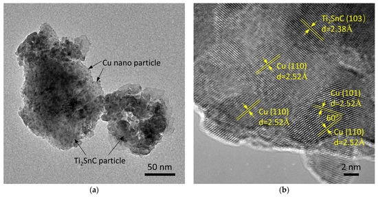 TEM characterizations were also carried out to examine the structures of the as-prepared Cu-coated Ti2SnC particles. In order to expose the Ti2SnC matrix, the particles were ground in a mortar. As shown in Figure 5a, the dot-like Cu nano-particles were distributed on the Ti2SnC surface. Based on the HRTEM image of a Cu-coated Ti2SnC particle, the plane (103) of Ti2SnC can be indexed, as shown in Figure 5b. Furthermore, the planes (110) and (101) of the Cu nano-particles can be identified as well. The XRD, SEM, and TEM evidence suggests that the Cu-coated Ti2SnC particles were successfully prepared.