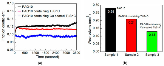 (a) Friction coefficient curves versus sliding time and (b) wear volume of GCr15 disks lubricated by PAO10 base oil containing Ti2SnC and Cu-coated Ti2SnC.