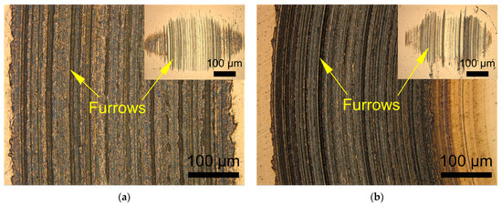 Figure 7 shows the optical wear images of the GCr15 disks after the sliding tests that were lubricated by PAO10 base oil, PAO10 base oil containing 5 wt.% Ti2SnC, and PAO10 base oil containing 5 wt.% Cu-coated Ti2SnC. As show in Figure 7b,c, some remnant Ti2SnC and Cu-coated Ti2SnC particles could be detected on the unworn surfaces of the GCr15 disks. For the PAO10 base oil, large continuous furrows could be observed, which could be attributed to two-body abrasive wear between the GCr15 tribo-pairs, as shown in Figure 7a. When 5 wt.% Ti2SnC was added into the PAO10 base oil, the furrows were diminished, as shown in Figure 7b. The wear scars of the GCr15 balls had similar wear morphologies, as shown in the inserts of Figure 7a,b. The addition of PAO base oil between the sliding interface could result in a low friction coefficient, where the friction coefficient was as low as 0.122. With the incorporation of Ti2SnC into the PAO base oil, the friction coefficient slightly came down (0.114). Wu and Xue et al. reported that, when Ti3SiC2 powders are doped into base oil, the friction coefficient could also be reduced, in which the friction coefficient could come further down with an increasing sliding speed [19,21]. This indicates that a base oil containing MAX phase powders can improve the lubricating behaviors of the base oil. However, in this study, it appeared that the Ti2SnC ceramic showed a superior lubricating effect in the base oil in comparison to the Ti3SiC2 MAX phase. In particular, for the PAO10 base oil containing 5 wt.% Cu-coated Ti2SnC, the friction coefficient was decreased by 22% compared the pure PAO10 base oil, in which the friction coefficient was as low as 0.095. As shown in Figure 7c, the furrows that were caused by two-body abrasive almost disappeared. Instead, a layer of tribo-film could be found on the wear track. The tribo-film, which was traced to the tribo-chemical reaction of the Cu-coated Ti2SnC, could further reduce the friction coefficient. Furthermore, the corresponding wear scar of the GCr15 ball was covered by a layer of tribo-film as well. The most likely explanation could be attributed to the modification of the layer of Cu nano-particles. On the one hand, the layer of Cu nano-particles might have been destroyed and distributed into the PAO10 base oil during the sliding process, which could result in a slight fluctuation of the friction coefficient. On the other hand, a layer of tribo-film induced by a tribo-chemical reaction could be generated due to the incorporation of Cu nano-particles, which can reduce friction and wear.