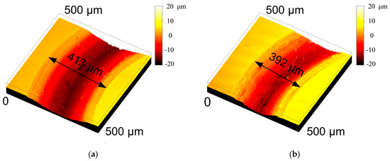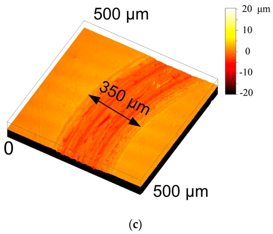 The 3D wear tracks of GCr15 after the sliding tests that were lubricated by PAO10 base oil, PAO10 base oil containing 5 wt.% Ti2SnC, and PAO10 base oil containing 5 wt.% Cu-coated Ti2SnC are shown in Figure 8. For the PAO10 base oil, the width of the wear track was as high as 413 µm, as shown in Figure 8a. When the Ti2SnC and Cu-coated Ti2SnC were incorporated into the PAO10 base oil, the width of the GCr15 wear tracks came down to 392 µm and 350 µm, respectively, as shown in Figure 8b,c. Furthermore, the depth of the wear tracks gradually became shallow when the Ti2SnC and Cu-coated Ti2SnC were doped into the PAO10 base oil. The variation in the GCr15 wear tracks also confirmed that the PAO10 base oil containing 5 wt.% Cu-coated Ti2SnC could display a better wear-resistant property. On account of the addition of Ti2SnC powder, the oil film strength could be notably elevated, which could reduce the friction coefficient during the sliding [26]. It is well known that Cu nano-particles can contribute to generating a stable tribo-film to diminish the destruction of lubricating films during sliding [27]. Moreover, Cu nano-particles can also increase the intensity of an oil film because of the adsorption effect of these Cu nano-particles, in which a higher intensity of tribo-film could lead to a better lubrication effect. Therefore, due to the synergistic lubrication effect of the Ti2SnC and Cu nano-particles, the PAO10 base oil within the Cu-coated Ti2SnC powder could exhibit superior lubrication behaviors.